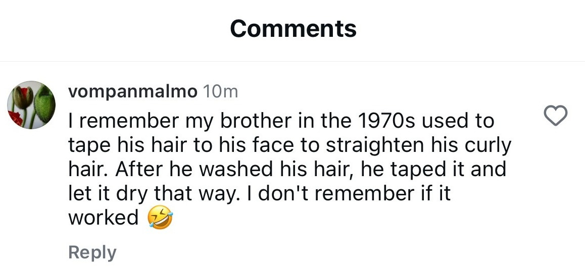 I got an Instagram comment from the sibling of a guy who used to try to *tape his hair to his face* to straighten it. Still trying to get in touch with him because I need to hear firsthand how this turned out for him.