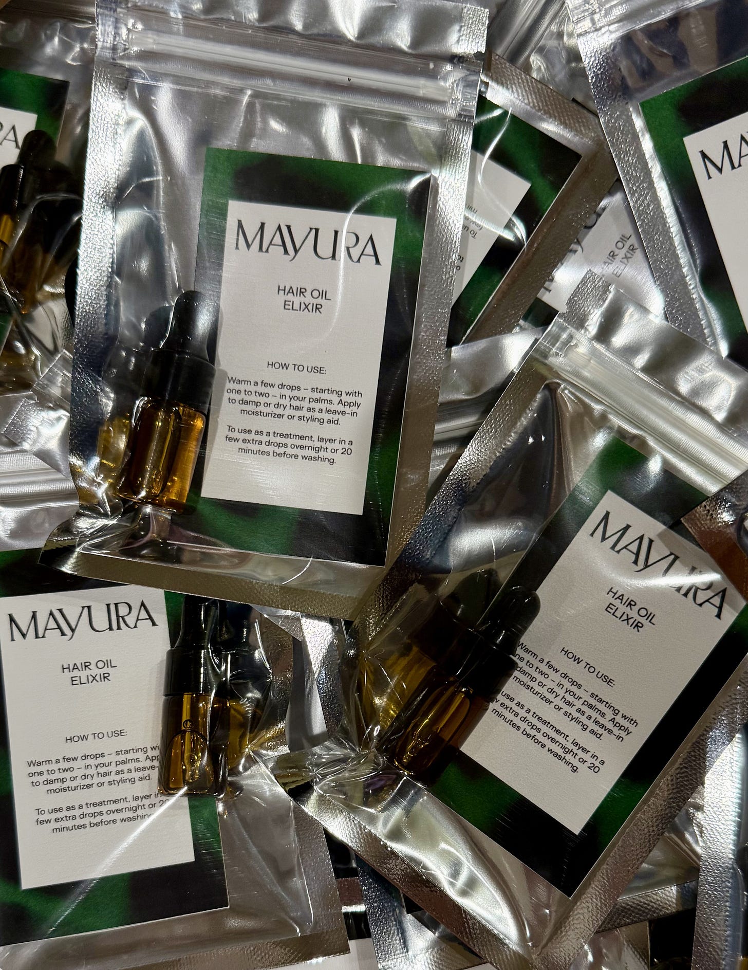 About a week ago, I flew to New Jersey. I went straight to my family’s home, where I had little glass vials, pipettes and mylar bags delivered so I could package up MAYURA hair oil samples with branded postcards – the front with our logo and instructions for product use, the back with my business card so we can stay in touch.